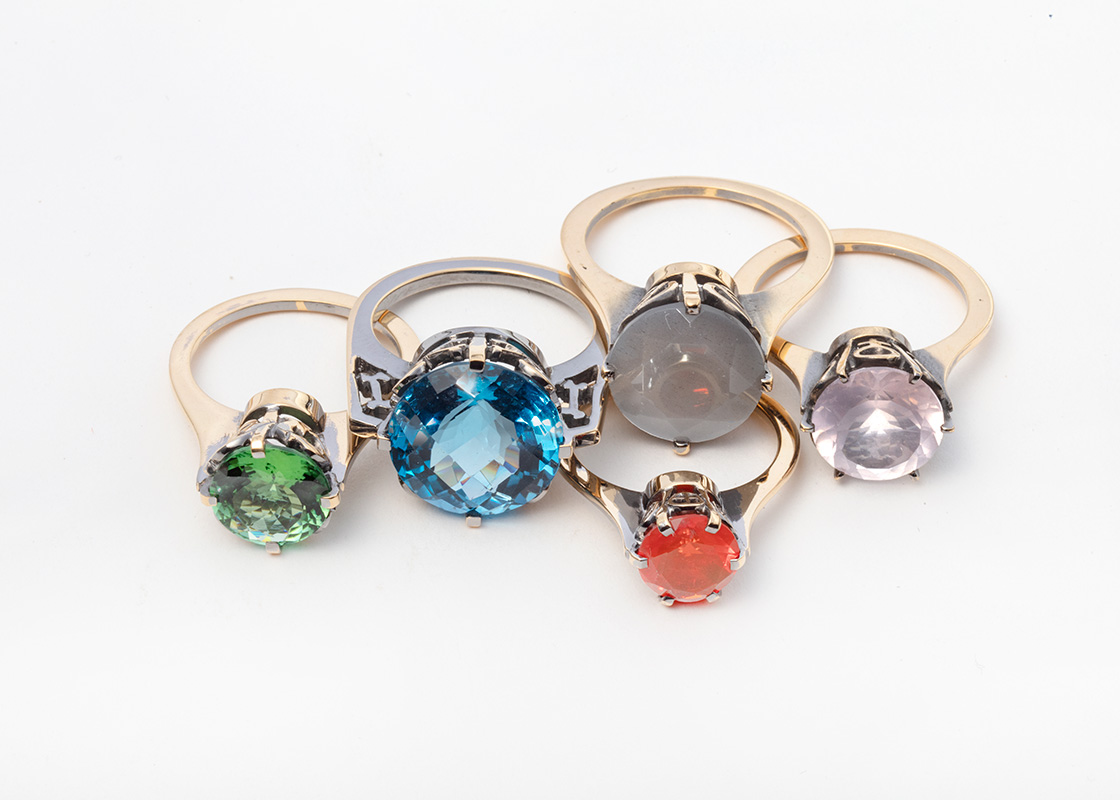 Klassiske solitærringe med holdninger. Udført som pladearbejde, og afformet, hvorfor denne serie ikke er unika, men kan bestilles I andre størrelser.